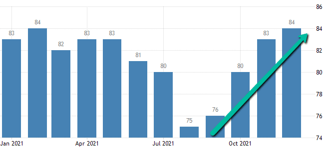 Home Builder Confidence: The NAHB housing market index in the US edged up 1 point to 84 in December of 2021, the highest since February and beating market forecasts of 83. Builders cited strong demand met with scarce inventory as their primary reasons for being optimistic.