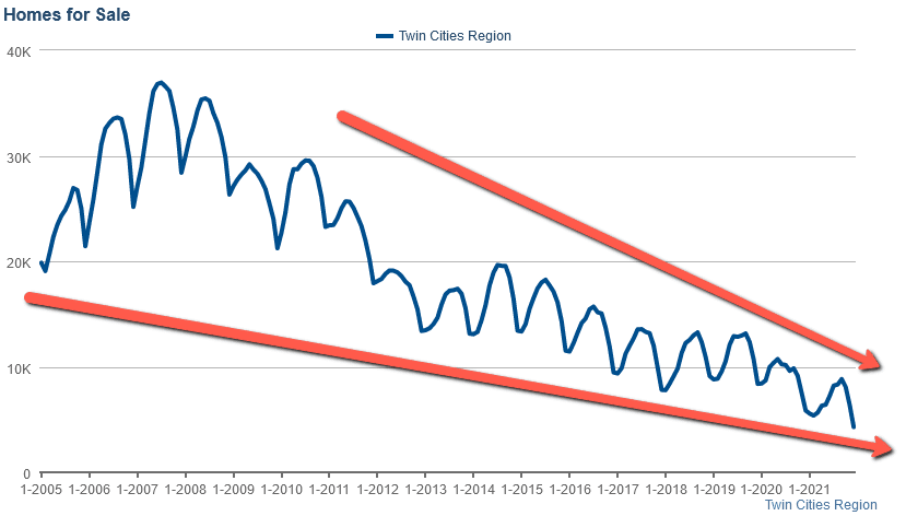 Home inventory in the Twin Cities fell 32% in December to 4,287 units (homes, condos, lofts & townhouses), a new all-time low and 20% below the previous record of 5,378 units from December of 2021. This will no doubt set the stage for another bidding-war-filled spring market as the seasonal rise in demand finds a worse inventory shortage than it found in 2021.