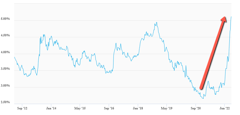 Mortgage Rates: Mortgage rates have moved up another 22% in the past month and are now up 65% YTD and up 93% from their cycle lows back in January of 2021. From a ROC (rate of change) perspective, that is the most aggressive rise in mortgage rates, ever. The bond market is now pricing in 10 (quarter-point) rate hikes for 2022 as the Fed continues to talk about "getting tough" on inflation.