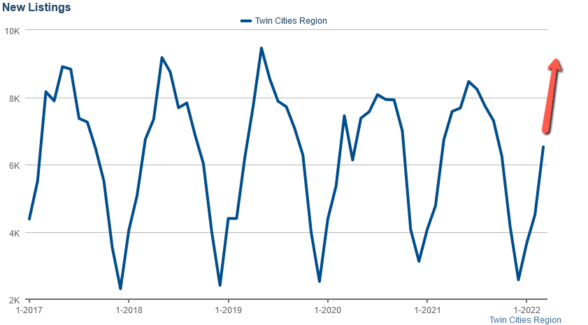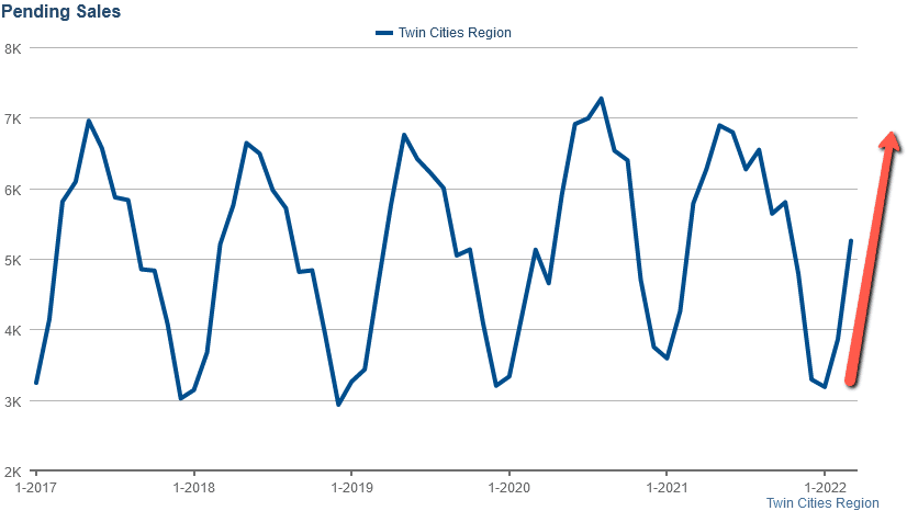 New Listings: 6,527 new homes, condos, and townhouses hit the Twin Cities market in March. That is up 44% MOM but down 3.1% YOY. We expect new listings, in pursuit of rising prices, to continue their seasonally dramatic incline through May or June.