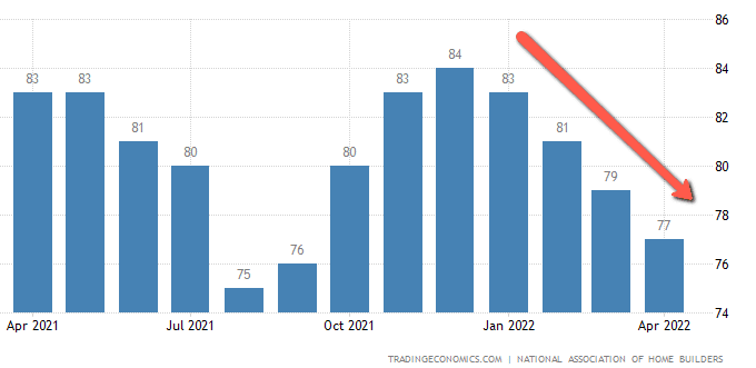 Home Builder Confidence: The NAHB housing market index in the US fell to 77 in April of 2022 from 79 in March, which was in line with market expectations. The index fell for a fourth straight month to the lowest level since September of 2021, as dramatically rising mortgage rates, persistent supply chain disruptions, elevated housing prices, and construction costs continue to destabilize the housing market.