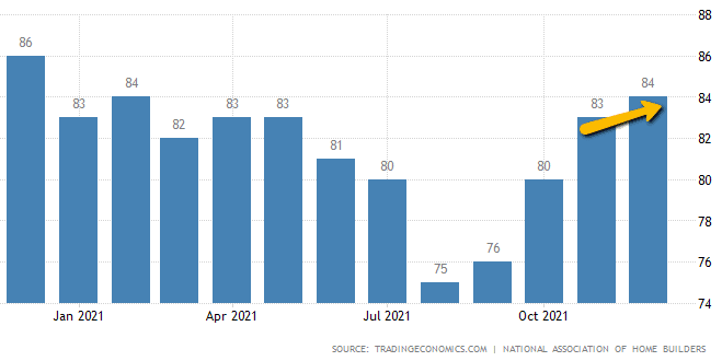 Home Builder Confidence: The NAHB housing market index in the US edged up 1 point to 84 in December of 2021, the highest since February and beating market forecasts of 83 with builders citing strong demand met with scarce inventory as their primary reason for optimism.