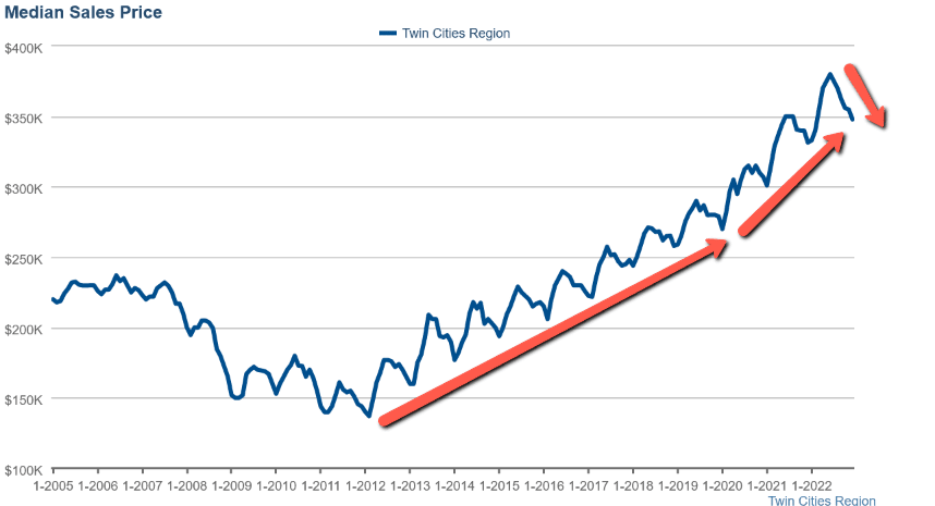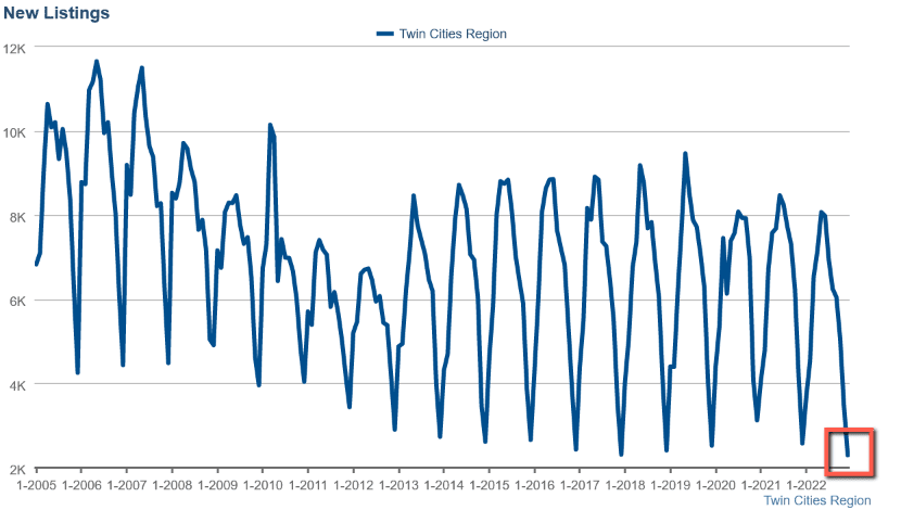 New Listings: 2,294 new listings hit the Twin Cities market in December which is down 33.8% MOM and down 11% YOY. Collapsing affordability is primarily impacting demand but it is also impacting new listings as some move up and move down buyers are deciding to stay in their current homes in the face of the higher prices and rates. With that said, pending sales have been falling at a higher rate than new listings which appears to be contributing to a larger seasonal correction in home prices than is typical.