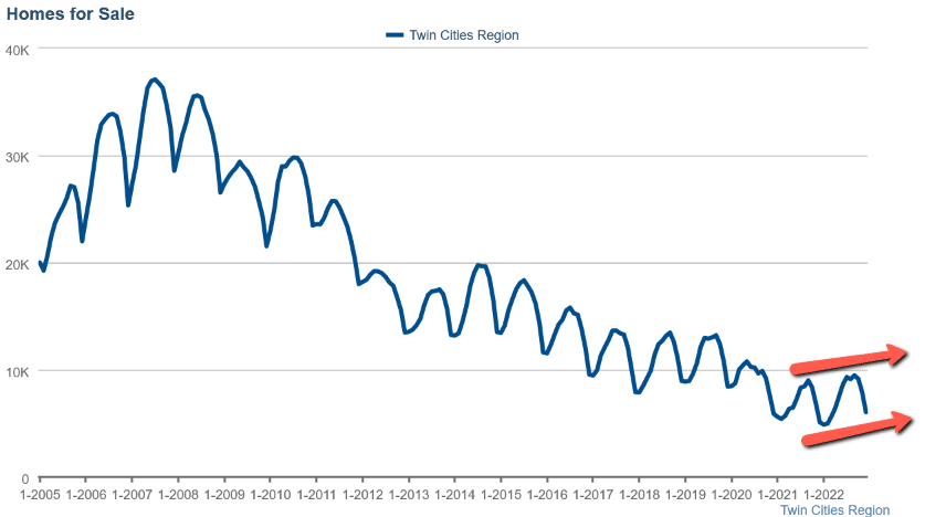 When housing demand last collapsed to this extent, back in December of 2007, that particular collapse in demand signaled the beginning of a housing crash and financial crisis that would affect housing markets across the entire country and would last through 2012 (5 years). The biggest fundamental difference in the setup then vs. now is that new and existing home inventory, both locally and nationally, was much higher on both a relative basis and on an absolute basis (28,500 units in the Twin Cities in December of 2007 vs. 6,000 units today). The biggest fundamental similarity in the setup to then vs. now is that we were in the midst of the last meaningful tightening cycle (of money and credit) by the Federal Reserve following what was arguably the loosest monetary policy in U.S. history, to date, which is essentially the same scenario we face now.