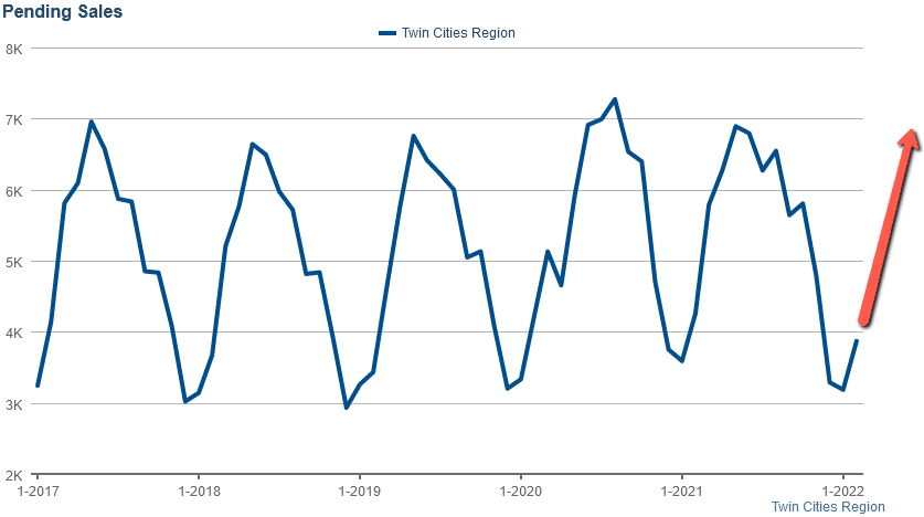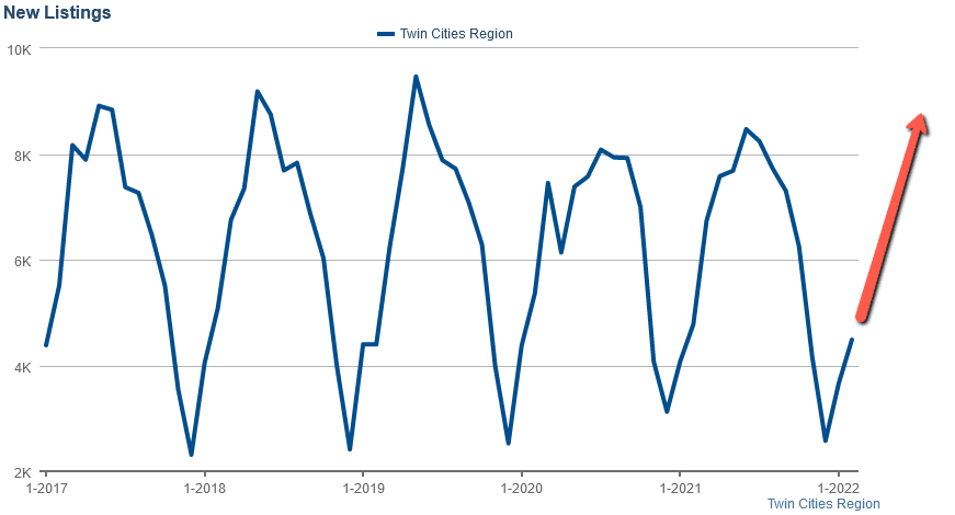 New Listings: 4,486 new homes, condos, and townhouses hit the Twin Cities market in February. That is up 22% MOM but down 6.1% YOY. The YOY decline in new listings is in part due to rising costs and supply chain issues which have made it more difficult for home builders and developers to add inventory on the new construction side. We expect new listings, in pursuit of rising prices, to continue their seasonally dramatic incline through May or June.