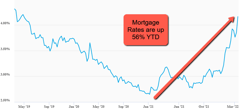 Mortgage Rates: Mortgage rates moved up another 8% last week and are up 56% YTD. That is the most aggressive quarterly move-up in mortgage rates since 1980 when mortgage rates moved up from 12% to 18%. The bond market is now pricing in a full 7 (quarter-point) rate hike for 2022. With economic data likely decelerating in Q2 of this year and with the NASDAQ and the Russel 2000 already bouncing into bear market territory (with the other indexes not far behind), it will be interesting to see how long the Fed holds on to the tightening narrative this time. If yesterday's rate hike itself were to mark the cycle peak for bond yields and mortgage rates, it wouldn't be the first time.