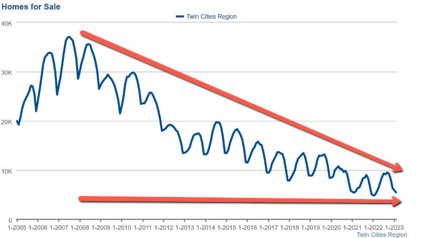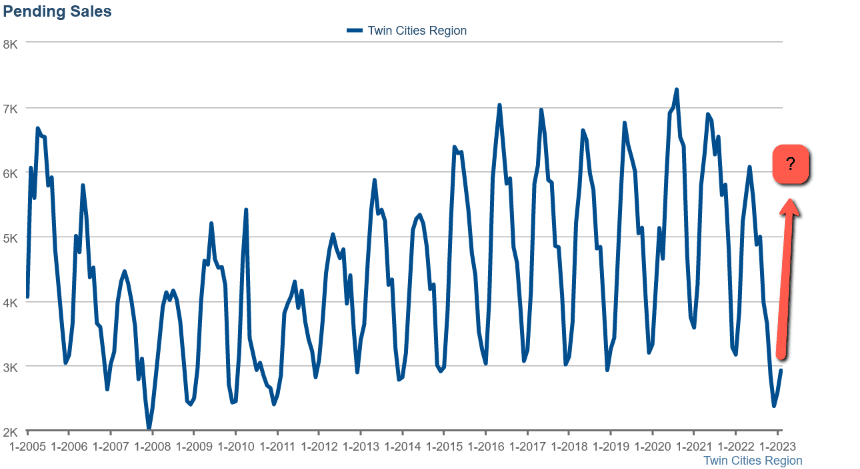Despite the new interest rate regime and the challenges that has presented to the market, home prices in the Twin Cities held on to their bullish trend during the winter correction phase. The higher interest rate environment has so far been significantly impacting both supply and demand as many current owners either can't afford to trade out of a 3% mortgage in exchange for a 6% mortgage or are just resistant to it for obvious reasons, limiting the market to the most motivated and qualified of the movers. With inventory levels back down near record lows, the stage is set for another spring rise in Twin Cities' home prices.