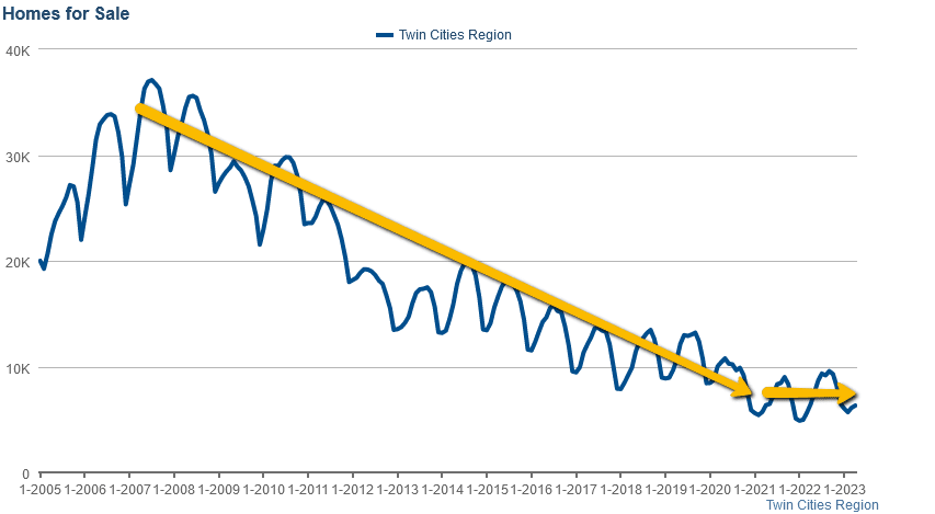 Home Inventory: The home inventory level in the Twin Cities moved up 3.7% in April to 6,353 units (homes, condos, and townhouses). That level is only up 1.3% YOY and remains historically, very low.