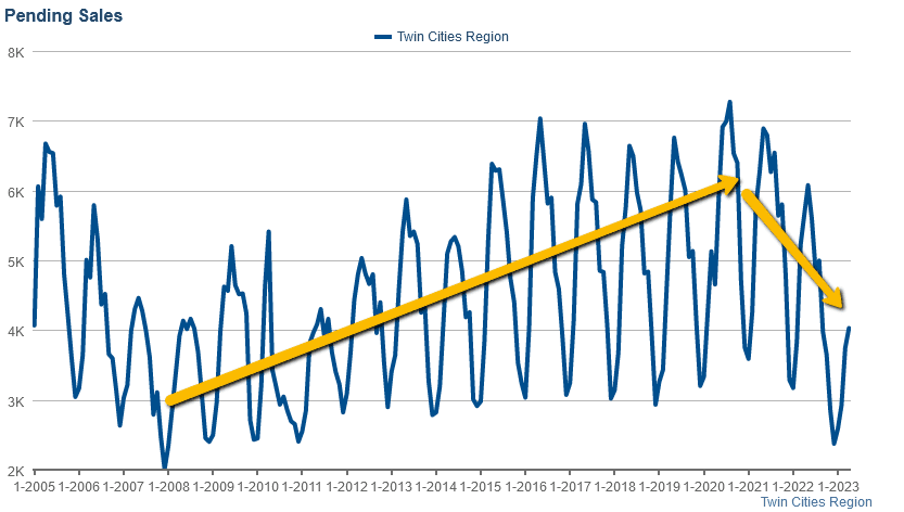 Pending Home Sales: 4,025 homes came under contract in the Twin Cities in April. That is up 7.5% MOM but down a whopping 28.8% YOY. That is the lowest level of April sales volume since April of 2008, as higher interest rates continue to have a contractionary impact on the housing market.