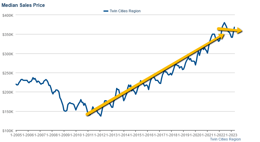 The Median Home Price: The Twin Cities' median home price moved up 3.6% in April to 368,000 but is down (.5%) in April for the first time since 2011 as higher mortgage rates continue to have a contractionary affect on the housing market.